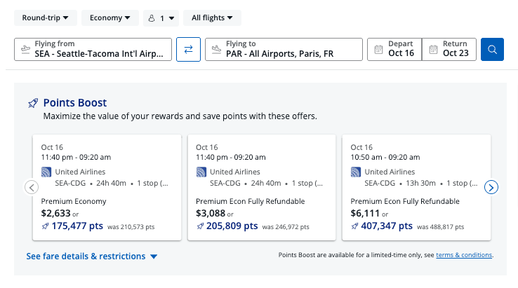 Then, I looked up round-trip flights from Seattle to Paris for the same dates. Out of 385 flight options, eight were eligible for Points Boost. They included two airlines — United and Air Canada — and a mix of economy and more premium options. None of the non-stop options were eligible.