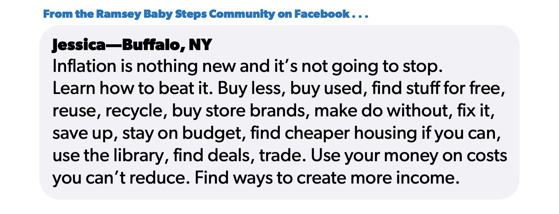 Jessica, another member of our Ramsey Baby Steps Community, listed all the ways that you can save money despite rising costs: “Buy less, buy used, find stuff for free, reuse, recycle, buy store brands, make do without, fix it, save up, stay on budget, find cheaper housing if you can, use the library, find deals, trade/barter. Use your money on costs you can’t reduce. Find ways to create more income. Inflation is nothing new and it’s not going to stop. Learn how to beat it.”