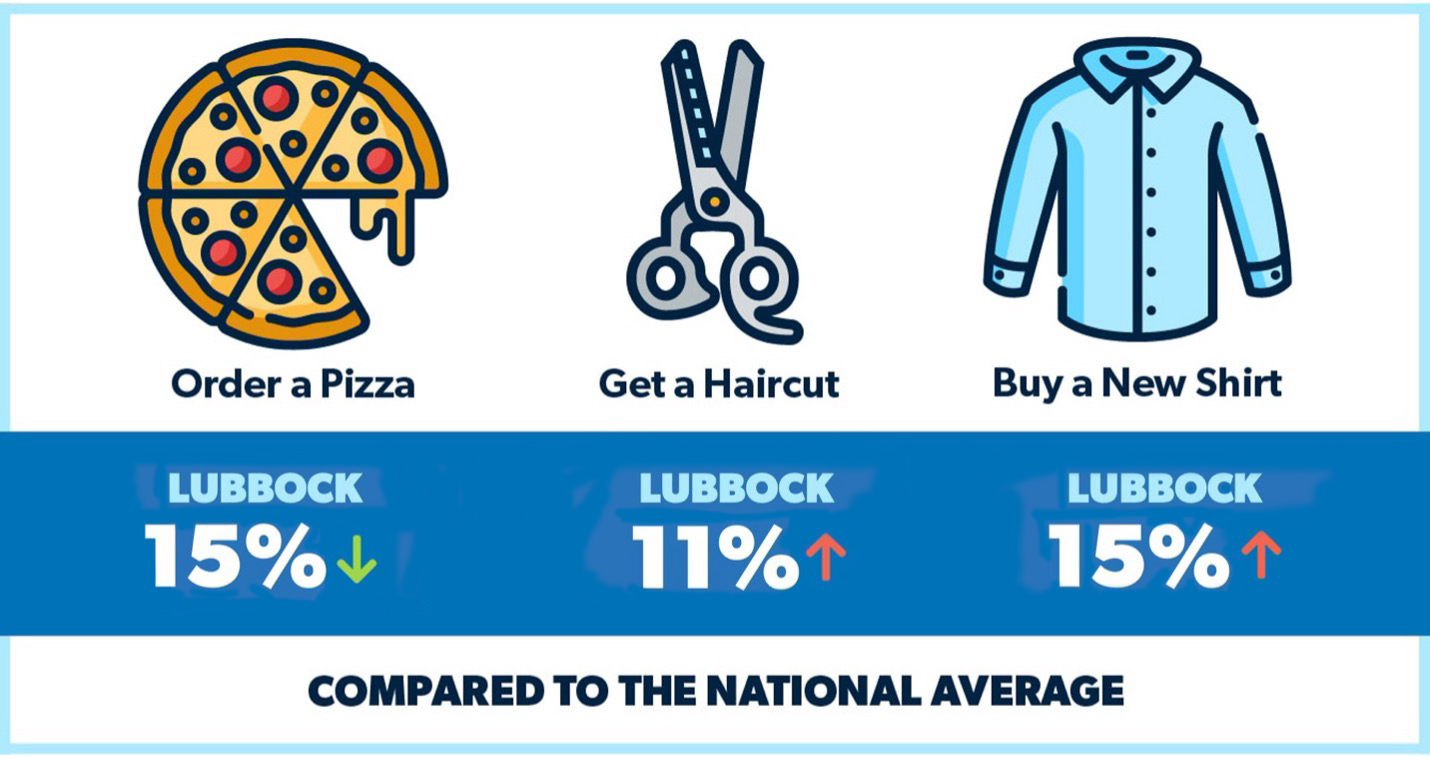 Lubbock, the “Hub City” and birthplace of Buddy Holly, represents the median of Texas cities for miscellaneous costs—3% lower than the national average. In Lubbock, you can order a pizza for $11, get a haircut for $31, and buy a shirt for $45. For reference, those prices are $13, $28 and $39 for the average U.S. city, respectively.