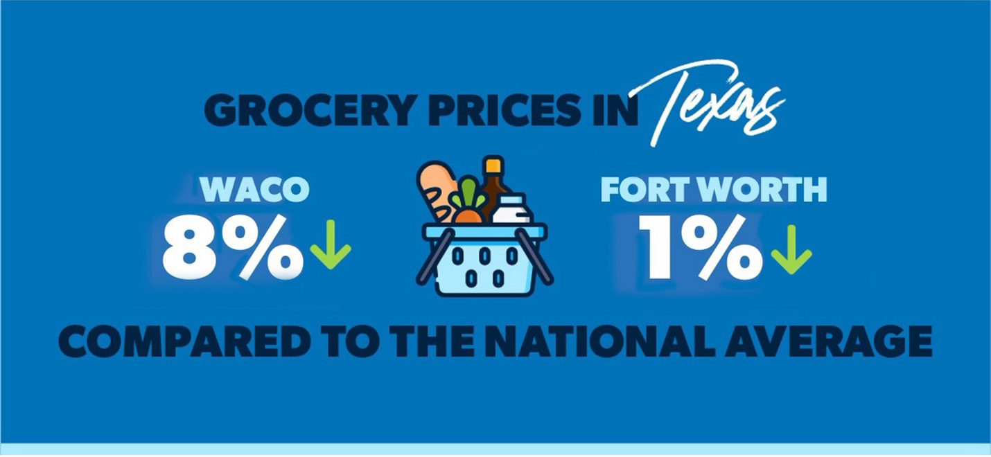 Grocery prices in Texas have a much narrower range—in a good way. No matter where you land, they’re going to be at least slightly below the national average. That’s right . . . no Texas city on the COLI list has higher-than-average grocery prices! They range from 8% lower than the national average in Waco to 1% lower in Fort Worth.